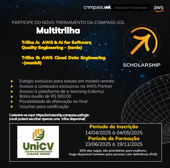 As inscrições já estão abertas e podem ser feitas até o dia 4 de maio, pelo link: https://scholarship.compass.uol/. Não deixe para a última hora!